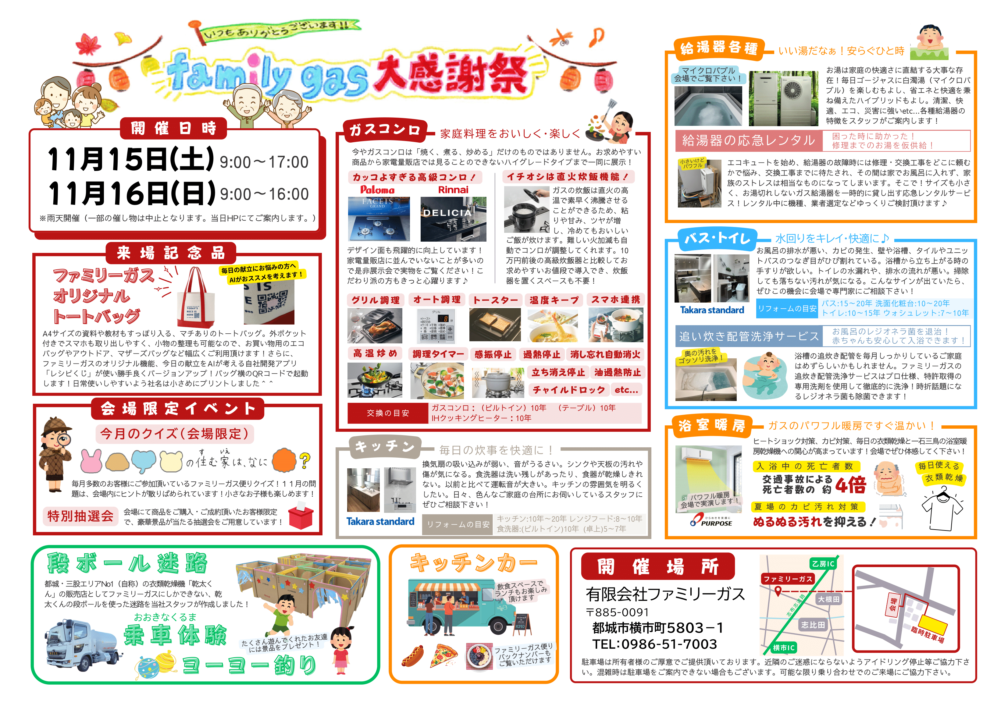 最近のガス器具はすごい。ガス給湯器でも、ウルトラファインバブル給湯器なるものが登場している。直径1マイクロメートル未満の微細な泡で、細かい隙間にある汚れを落とす作用のあるお湯を出湯できるすぐれものだ。又、深夜電力を使ってエコキュートで作ったお湯をタンクに貯め、お湯の使用量が多い時には、ガス給湯器が働きだすハイブリッド給湯器なるものもあります。湯切れがないと好評です。最近問い合わせが多いのがガス衣類乾燥機です。電気式に比べ、乾燥時間が短く仕上がりがいいとのことで利用者が増えています。ガステーブル、ビルトインコンロも進化をとげています。食のスペシャリストが監修したオート調理が満載のオート調理のできる、コンロもある。もちろん、ごはんの炊ける炊飯機能もついているので、ごはんを炊きながら1つのコンロで、主食・副食・汁物と料理できる。一方、これから活躍するであろう、ガスストーブ・ガスファンヒーターは灯油のように給油の必要がないことから、例年引きあいが増えています。なかなか皆様にお見せする機会がないので、今回、最新の省エネガス器具を一堂に展示し、今後の買い換えや増設に参考になればと企画しました。今まで都城支部での合同展示会という形での開催でしたが、ファミリーガス単独での開催ということもあり、全てのことを手作りで準備しました。日頃の当社ガスのご利用に感謝の気持ちを込めて、開催します。是非、足を運んで下さい。大感謝祭は11月15日(土)16日(日)です。